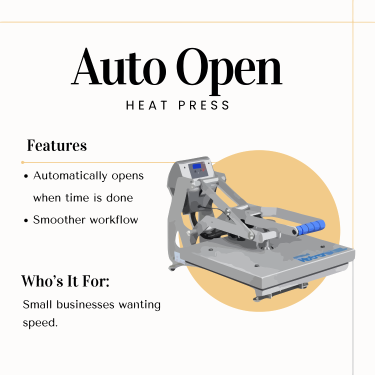 An auto open press is made for people who want a faster workflow and fewer mistakes. It’s ideal for beginners who forget timers, small businesses doing steady daily orders, and anyone who wants to avoid over pressing their transfers. If you want speed and consistency without moving into industrial equipment, this is the right choice.
