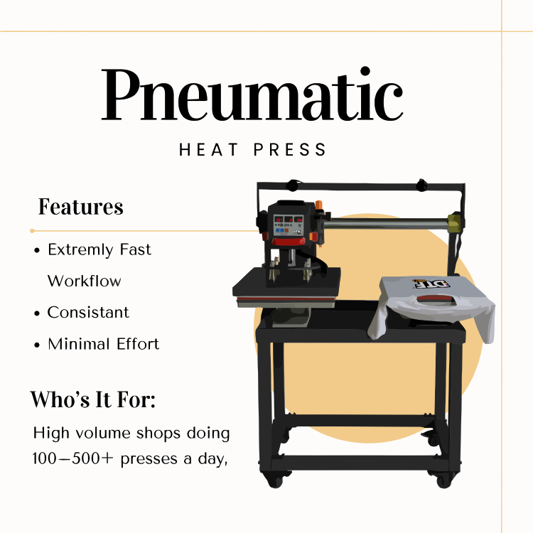 A pneumatic press is designed for high volume production shops or businesses pressing hundreds of items per day. If you need consistent pressure every single time, work with thicker or specialty materials, or run a full apparel line where speed matters, a pneumatic press delivers the professional level performance required for large scale production.
