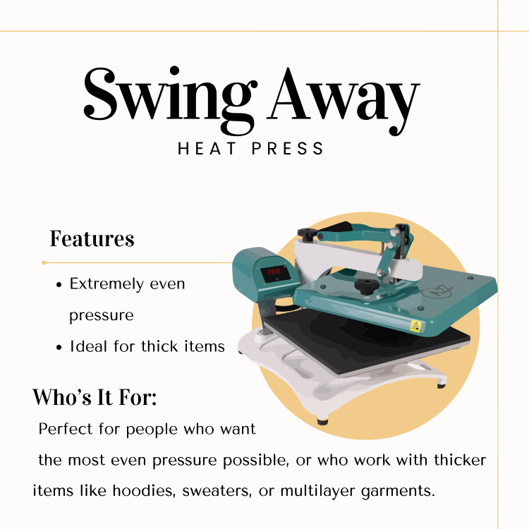 A swing away press swings the top platen completely to the side, so the heated surface never sits above the garment as you load it. That gives more even pressure and makes it safer and easier to position items and press thick hoodies or heavy fabrics. Swing away presses take more room and are generally a bit slower to operate, but they’re a smart choice if you press a variety of garment types regularly.
